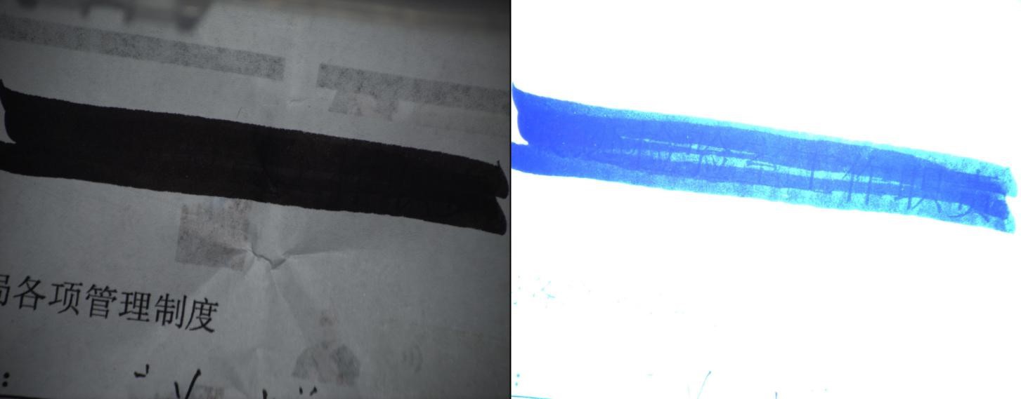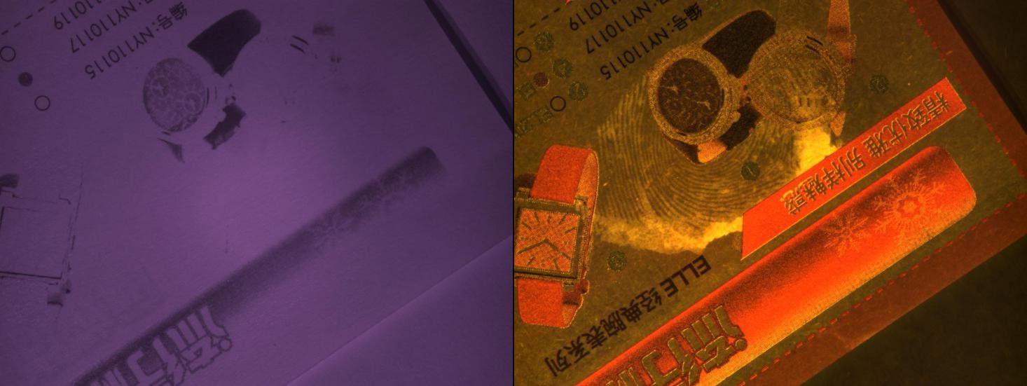 白光条件下油墨涂改后的效果 紫外光成像下效果